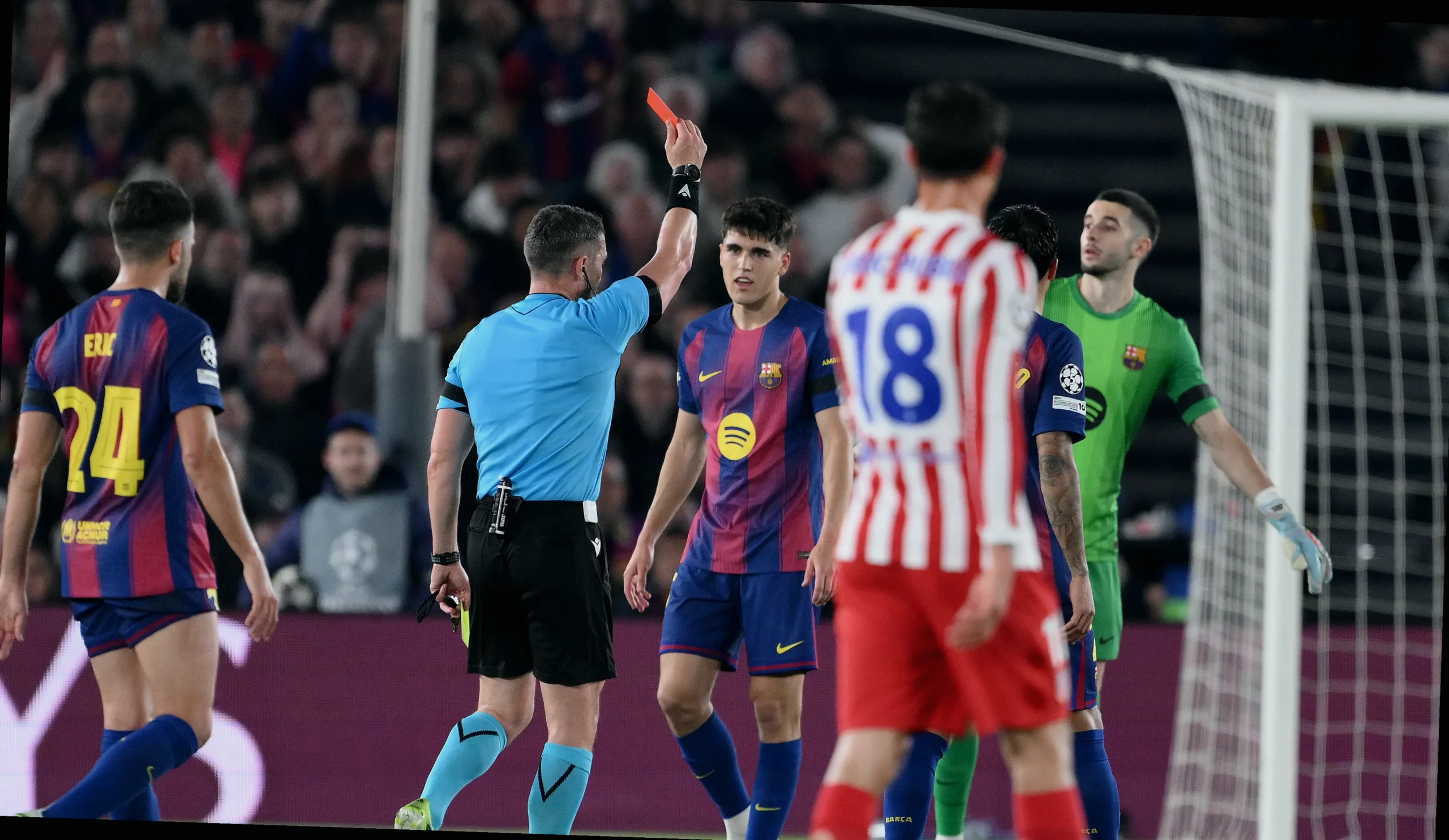 La dinámica cambió de forma brusca en el minuto 41. En esa jugada, el árbitro mostró tarjeta amarilla al defensor Pau Cubarsi. Pero entonces intervino el VAR y la decisión fue modificada: la acción terminó sancionándose con tarjeta roja directa. Ese ajuste alteró por completo el guion del partido y, sobre todo, la capacidad del Barcelona para competir en igualdad numérica justo antes del descanso.