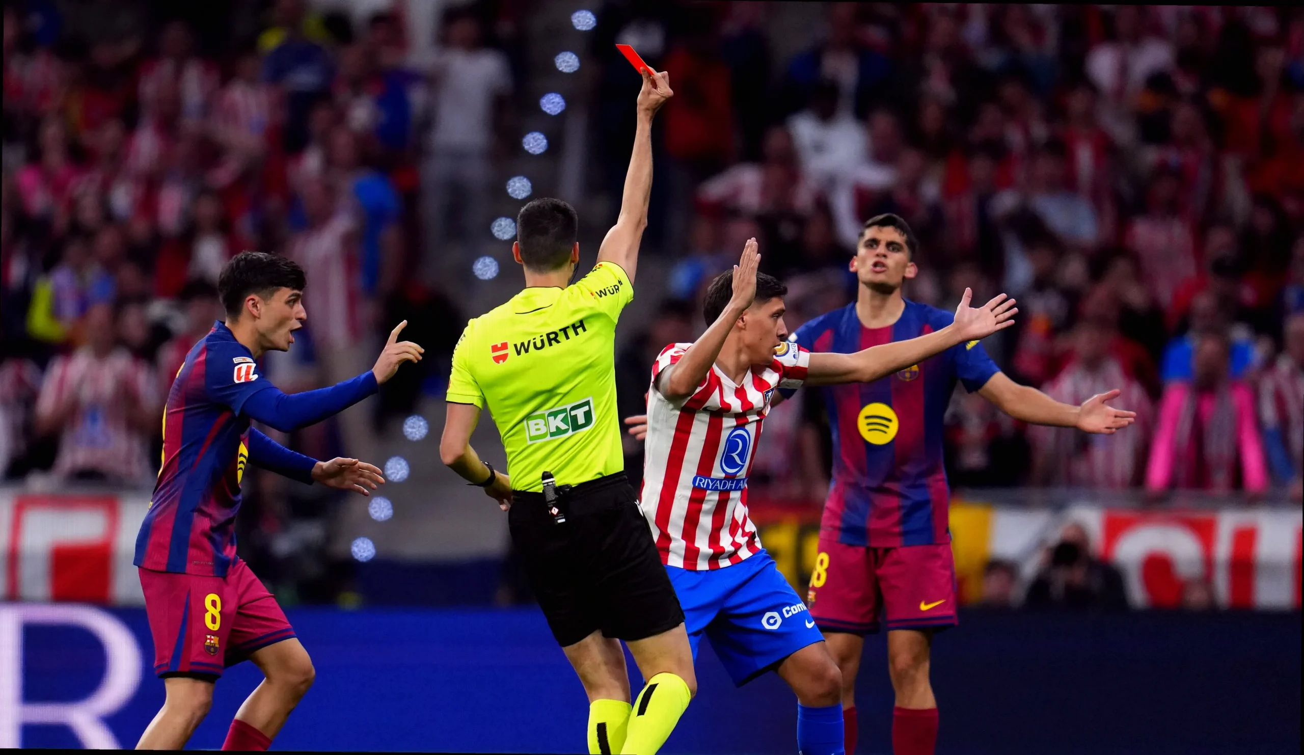 Sin embargo, desde la sala del VAR, Mileru López señaló la necesidad de revisar la decisión. Tras el aviso, el árbitro terminó modificando el castigo, pasando de la roja a una sanción menos severa (tarjeta amarilla), lo que desató el enfado en el entorno del Atlético Madrid.